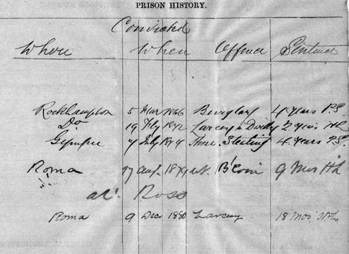 The 4 years in Brisbane Gaol from 1874 to 1878 did not deter him from re-offending, though. His offences of dishonesty spanned 1866 to 1880, his final term being 18 months for Larceny at Roma.
