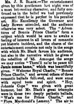 Then we tried to bore Their Excellencies to death with a night of Mr Black’s ‘peculiar art’. This appeared to involve an endless stream of depressing songs about the Battle of Culloden. ‘Deeply pathetic ballads’ indeed.