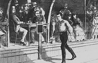 The Flying Pieman performed here yesterday the feats which he proposed performing at Brisbane, viz.: wheeling a barrow half a mile, running forward half a mile, running backward half a mile, walking one mile, picking up fifty stones one yard apart and placing them in a basket; as a gig could not be procured, he, instead carried a large goat half a mile; and made thirty eight leaps 2 ft. 10 in. high, fifty leaps were the number he intended having made, but as the bars were put four inches higher than he ordered, he was foiled in the remaining twelve. He, however, completed the whole undertaking in 85 minutes, being ten minutes less than his stated time, although the day was very sultry. He now talks of trying the tape feat; that is, to wind, while walking, a piece of tape 100 yards long, around a pitchfork handle, one inch and a half in diameter, and placed perpendicularly in the ground. This will, however, depend upon the encouragement he receives.