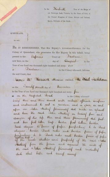 Before I publish the third part of A Brief History of Queensland Bushranging, I wanted to share the indictment of James Alpin McPherson, alias The Wild Scotchman, who bailed up and stole from the mails relentlessly in the mid 1860s. He did not injure any of his victims, and this is why this particular bushranger was able to finish his sentence, return to the community, start a family and pass away in a horse riding accident in middle age.