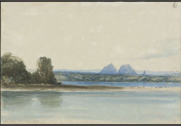 Some of the views depicted here can still be seen – the reef, the Glasshouse Maintains, the distinctive shape of the Brisbane River and those blue ranges in the distance. The foreground has changed, and tragically, the traditional owners have been moved on. Sometimes, if you look at a certain angle, you can still see the lines of the old town, as it was before we started the remorseless march of progress.