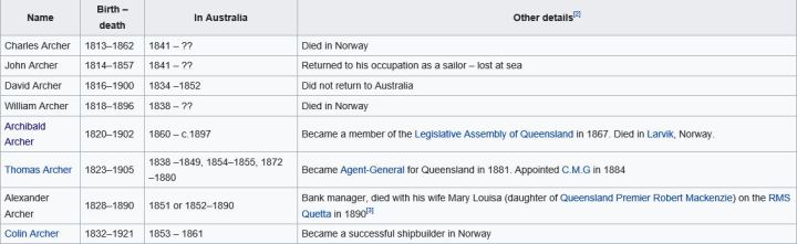 There were so many Archers. Thirteen in all, and seven of the male Archers were involved in Queensland’s early European history. Originally from Scotland, the family moved to Norway in the 1820s, and then to Australia, where the Archer sons made their presence felt, opening up the Fitzroy River, the Rockhampton area, Woodford and the Brisbane River Valley. After researching them individually and then collectively, I have decided to use the nice, straightforward, Wikipedia table: