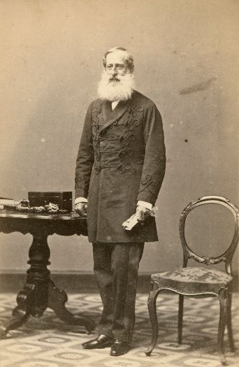 A full-length portrait in a faux parlour. Often the dress, props and pose are clues to a subject’s status. A serious looking gentleman with an impressive snowy beard, wearing a distinctive embroidered jacket. He holds a scrolled document, and on the desk is a wooden box. Perhaps an architect or a surveyor.