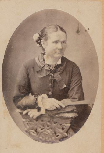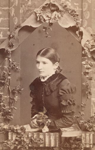 This young woman is resembles the seated lady on the left of the sisterly group above. She is photogenic, and is posed against a rose covered “window” with a rose in her hand and a book under her elbow. The photographer might have instructed her to look wistful. However her downcast stare and the dark clothing suggest mourning.