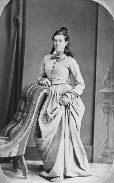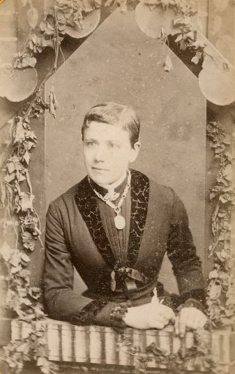 This lady is leaning out of the same “window” as the previous sitter. Again, she is photogenic enough for the image to capture intelligence and interest. Unusually, her hair appears to be short – unheard of at the time. It may be out of sight in a bun, but it looks like short hair. Although she has no obvious props to suggest a love of reading, or intellect, the photograph conveys a lively spirit, which is astonishing considering the unforgiving corsetry required to create the “wasp waist” of the era.