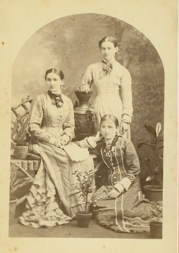 A group of sitters, presumably sisters, posed graduating from the floor to standing up, punctuated by potted plants and an urn. These ladies have the tight waists and simpler skirts of the 1880s.