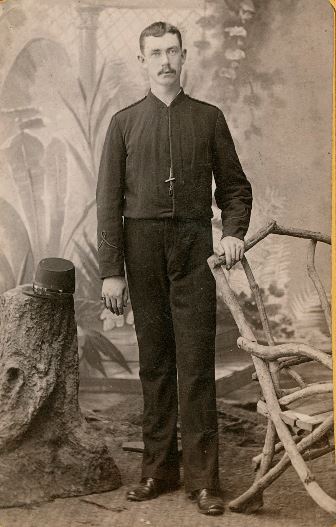 Just as serious, but much less miserable, is this young man posing against a painted background next to some sort of straw-decorated contraption meant to imply the great outdoors. He is heavily dressed, indeed his ensemble seems a little snug. A cabbage-tree hat adorns whatever that decoration is meant to be.