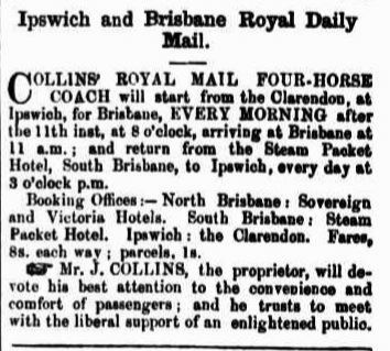 MAIL AND PASSENGER COACH FOR IPSWICH.—Mr. James Collins, contractor for the daily mail between this place and Ipswich, has purchased a suitable four-wheeled carriage for the conveyance of mails and passengers. The vehicle is light in construction, admirably adapted for the use for which it is intended, and fitted with seats, which are ornamented with red cushions. The trial trip proved very satisfactory, and we doubt not but that the public will show their appreciation of the enterprise by supporting the coach, which we have long desired to see established. We shall endeavour, by our next issue, to publish particulars of fares, times of leaving, time consumed on the journey, and keep the new conveyance before the public in proper form.