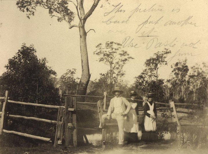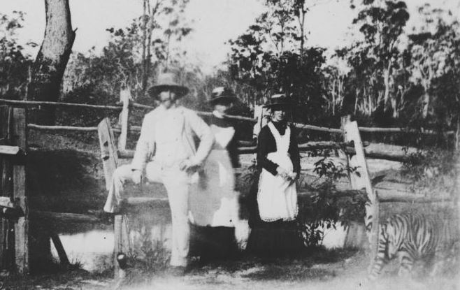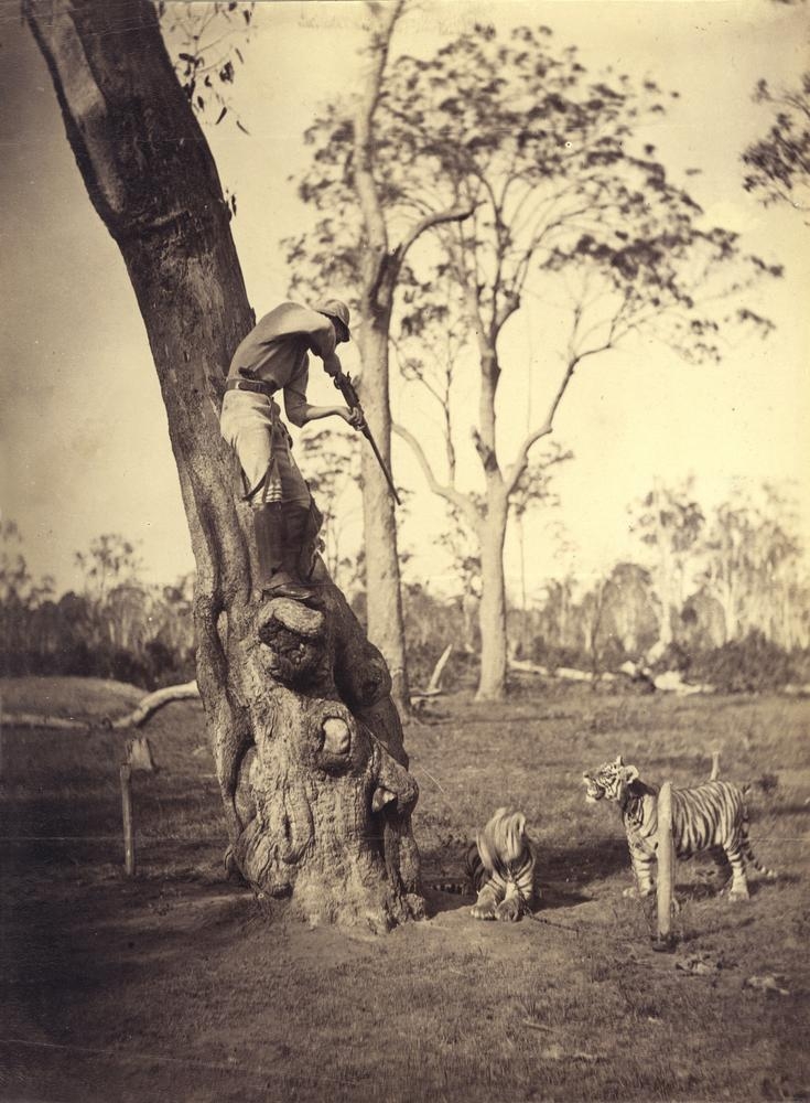Another photograph of the Toombul menagerie has a young man named James Trackson up a tree and posed as if aiming a gun at two tigers below. Trackson had been a student of electrical science in the UK, before emigrating to Queensland and helping to introduce telephone and electrical services here. He became one of Brisbane’s most prominent citizens and the proud (and much-photographed) owner of the first horseless carriage in the colony. I do hope that the photo is just posed to look like he was aiming at the tigers, and not actually shooting at them – the poor beasts are chained.