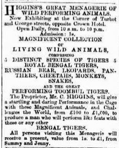 On the morning of 21 November 1888, when Higgins and his employee Peter Bertram were cleaning the cages, a tiger named Jimmy got out of his cage and chased Bertram down Turbot Street, mauling him badly about the head. Higgins’ arm was badly injured when he inserted it between the tiger’s jaws to remove Bertram’s head. Both men spent some time in hospital.