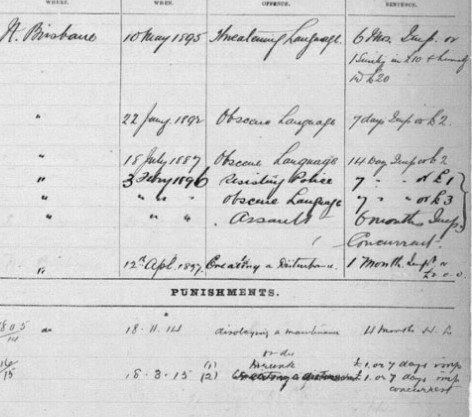 Without further ado the Police Magistrate sentenced defendant to six months’ imprisonment for the assault on his wife. Defendant’s shirt (white at one time) was saturated here and there with blood – the result of the tussle with the constables in a narrow passage, when defendant struck his head with great violence on a banister, making a cut on the forehead over an inch long.