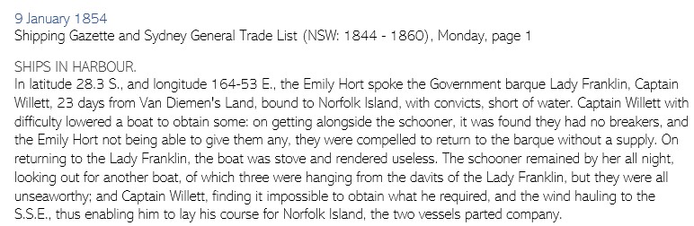 Well, that was odd. Buried deep in the shipping reports from early January 1854 was a report of an awkward marine rendezvous between the Lady Franklin and the Emily Hort on 06 January 1854. The Lady Franklin had been well-provisioned on departure, and now she was out of water and all of her boats were suddenly unseaworthy?