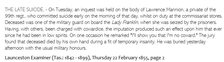 The Court Martial of the three soldiers who had been on duty on the barque finally came to an end with sentencing in April 1854. Sergeant Allen was reduced to the rank of private soldier (with a strong recommendation to be released immediately from arrest and restored to his previous station), Private Michael Durr was found guilty and transported for life, and Private O’Keefe was honourably exonerated. Although only three of their number were tried, all of the soldiers who had been on board the Lady Franklin felt their reputations had been tainted by accusations of cowardice.