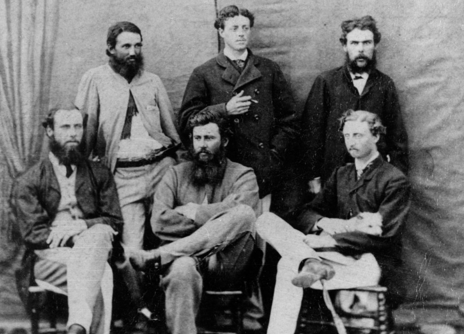 This photograph shows the many moods of group photography. Two of the men at the back slouch, the men in front have various leg-crossings. None look comfortable. Their facial expressions are priceless.