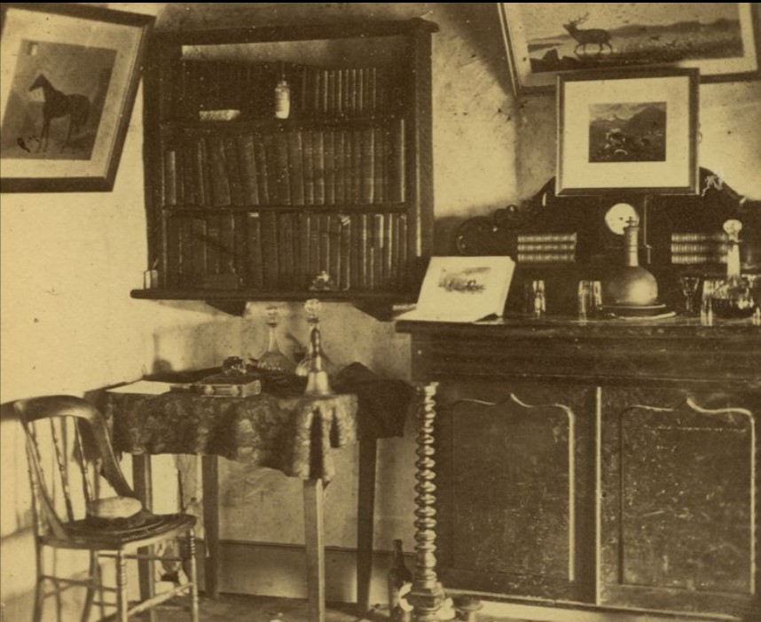 Something that isn’t shown very often is the interior of a house. In this case, it’s a home on the Dawson River. The owner has decorated this corner with pictures of horses and stags – the better to remind one of Home – and has an abundance of serious-looking books. Whoever they were, they had at least one servant (the bell), and were rather fond of a drop of wine, port and possibly sherry, judging by the bottles and decanters. Enjoying the contents of the bottles would make negotiating the spindly-legged chair and tiny writing desk rather difficult. Honestly, didn’t anyone like to sit comfortably?