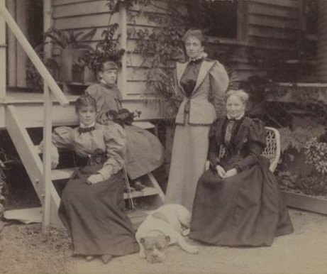 The Hume family in the 1880s. They include: including Mary MacIntyre with violin, Ethel Hume standing, Katie Hume seated on right, with dog. Everyone looks utterly miserable, including, hilariously, the dog. (To be fair, they were probably just trying to look ladylike whilst waiting for the photographer to tell them to relax.)