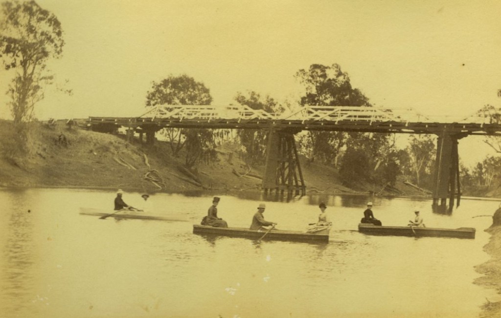 Families rowing on the McIntyre River (under the new McIntyre Bridge) in the Goondiwindi area in the 1880s.