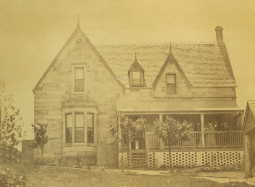 A family poses on the verandah of a pretty stone cottage in Spring Hill, Brisbane. 1870-188os.