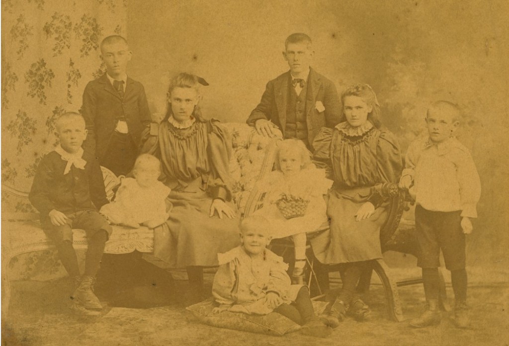 The toddler seated on the floor seems blissfully unaware of the helpless misery to come, as etched in the faces of the older children. Perhaps this was a family that believed in the restorative powers of cod liver oil.