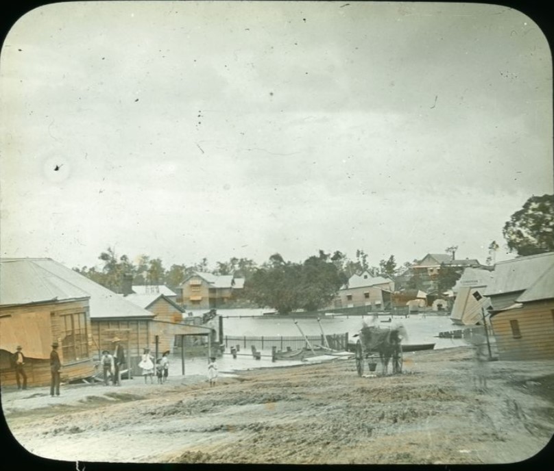 Colorized photo of flooded houses in Brisbane 1893Floodwaters seen from Denmark Hill, Ipswich 1893Charlotte Street Brisbane in floodA wooden boat was used to convey pedestrians across the street, Brisbane.