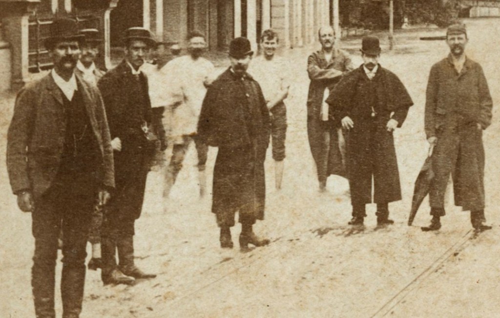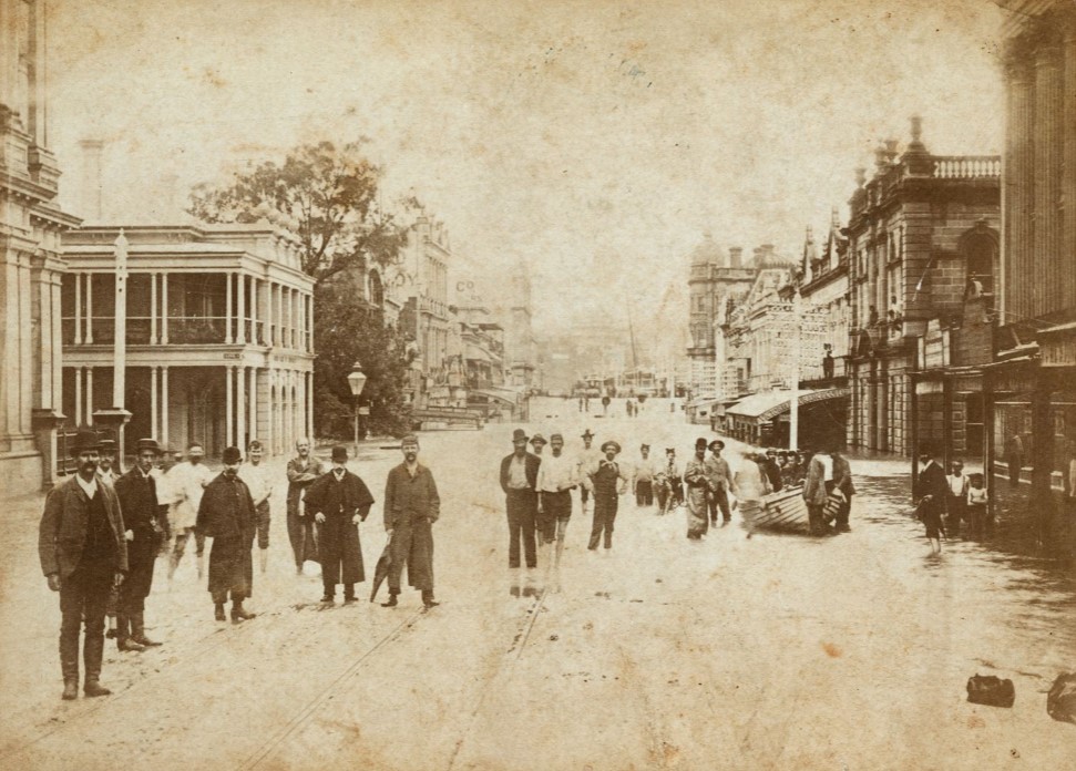 Flooded Queen Street BrisbaneDetail from Queen Street photo. “It’s always the lower orders who enjoy this sort of thing, isn’t it?” (see the merry chaps at the back).