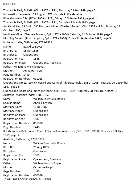 While William Townsville Boyes was considered at 16 a little overage for the Rockhampton Orphanage, he still had to wait to claim the land in Sturt Street for his own. Once he was of age, he was able to take the case to the Civil Sittings of the Townsville Circuit Court in May 1887, and he had a win against his step-father. Mr Hof was quite put out about this reversal of his fortunes. The land would prove handy, because Annie Harrison had said yes to William’s offer of marriage. Their first child, Eva Alice Boyes, was born the following April.