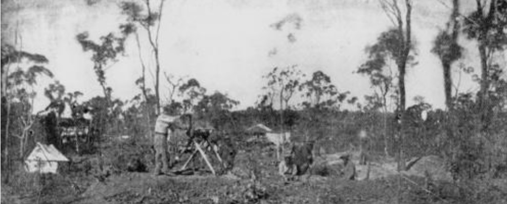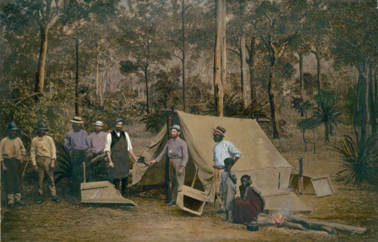 This photograph of men at their campfire with their trusty dog in the foreground is from the collection of the National Museum of Australia. It was originally a broken photographic glass plate, and was restored and repaired by ANM staff. The photo shows a large tent with a leaf bower, the tin pots and billies, and the relaxed demeanour of the subjects. Life is hard, but the camp has been set up, the billy is boiling, and it’s time to relax.