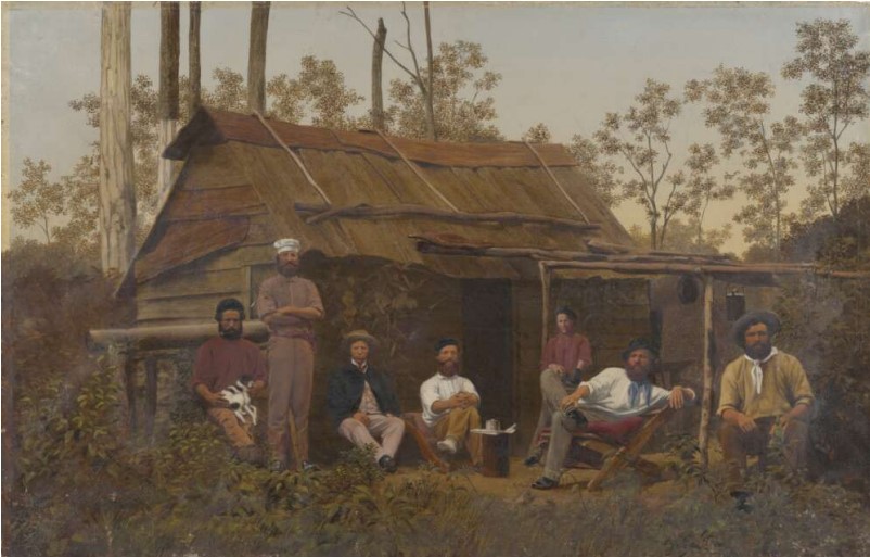 Another oil painting on albumen photograph from the collection at the National Library of Australia. This group has a hut to shelter in, and (of course), there is a dog in the photo. The pots and billy still hang up, this time under a frame that may become a verandah in time.