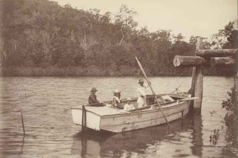 J. Trackson and friends punting on the upper reaches of the Brisbane River, 1884. John Oxley Library, Trackson Family Photograph Albums.
