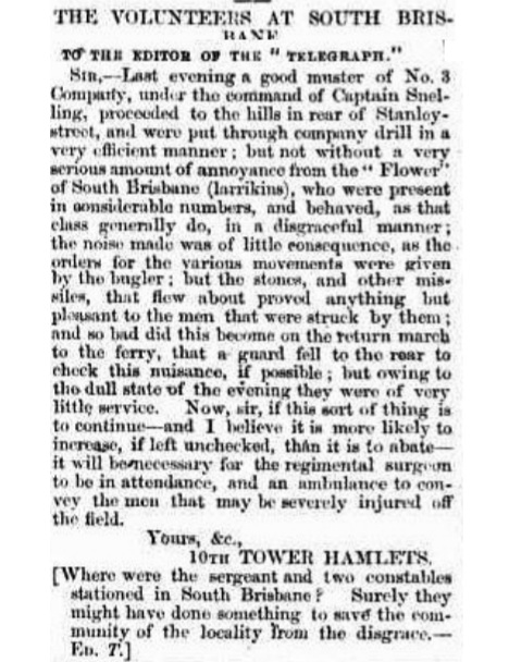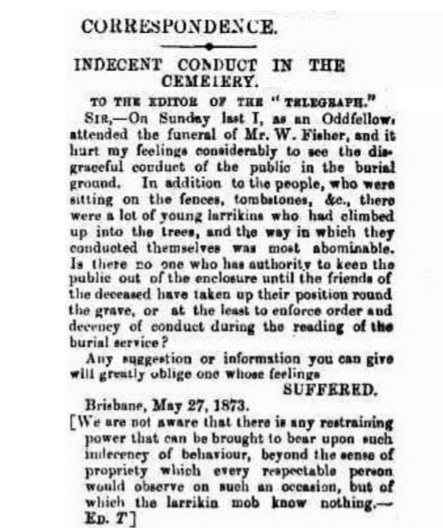While larrikinism in its more organised and criminal form would make its way to Queensland in the coming decades, the kind of behaviour described by the good citizens of the Colony to the editors of our newspapers in the early years, was often little short of comical.