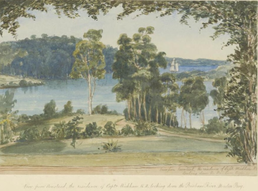 Henry John Douglas-Scott-Montagu, 1st Baron Montagu of Beaulieu (1832-1905) – what an exhausting name. He became a politician in his native England, but when he was a young man, afflicted with asthma, he travelled to warm British dependencies and sketched. On a visit to Moreton Bay, he – naturally – stayed with Captain John Wickham, RN, and sketched and painted his surroundings.