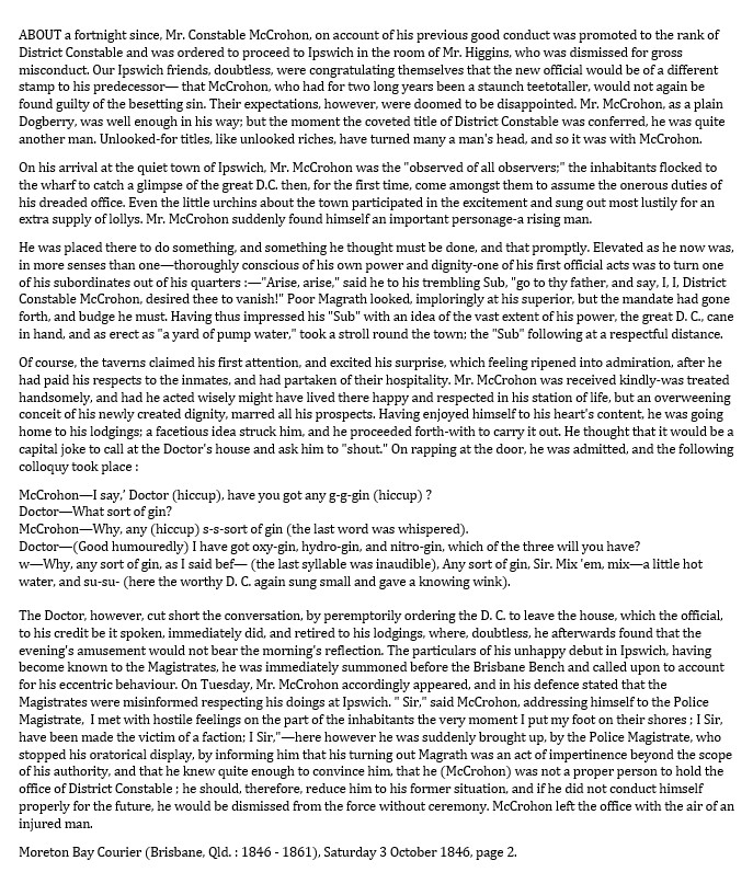 It seems that McCrohon, who had hitherto enjoyed an excellent reputation and was a teetotaler, arrived in Ipswich and met with hostility. He was accused of high-handedly turning one of his Constables out of his rooms, and of becoming drunk and pestering Dr Dorsey for a drink. This was reported to the Brisbane Magistrates, who ordered McCrohon to attend and answer to his behaviour. The Moreton Bay Courier reported all of this in exceedingly colourful prose. (Appendix 1)