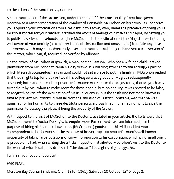 McCrohon’s visit to Dr Dorsey, “Fair Play” contended, was to ask for the address of Mr Furber, whom he intended to hire to cart his possessions to Ipswich. “Fair Play” was willing to verify these claims by affidavit for the Courier’s readers. However, DC McCrohon had already been demoted and removed from Ipswich, and the claim went no further.