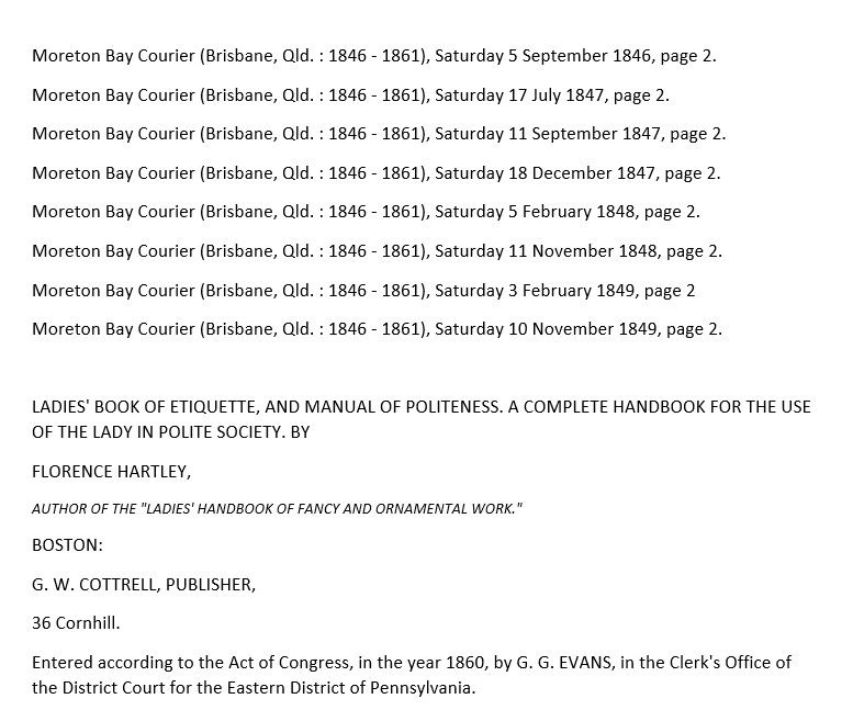 When women drank to excess, raised their voices, or behaved in a disorderly way, their treatment by the Bench and the press was less indulgent. Even their descriptions of the women are pejorative. The standards of behaviour these settlers’ wives and immigrant servants were being held up to were quite exacting, as described in great seriousness by one Florence Hartley in “The Ladies’ Book of Etiquette, and Manual of Politeness.”
