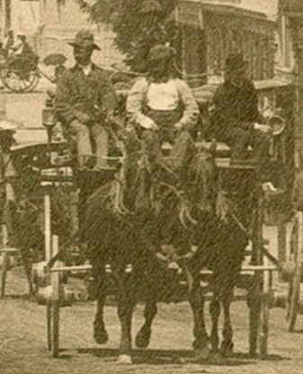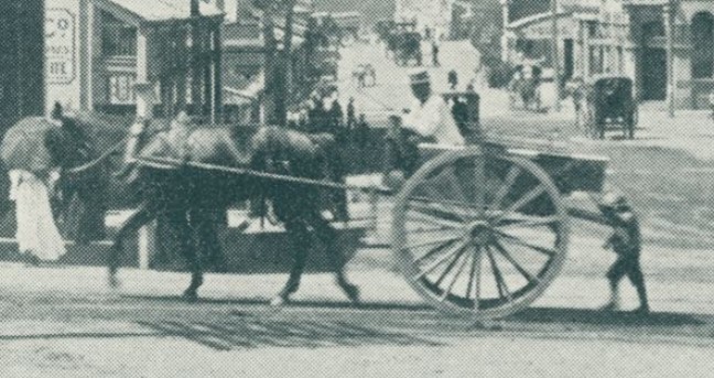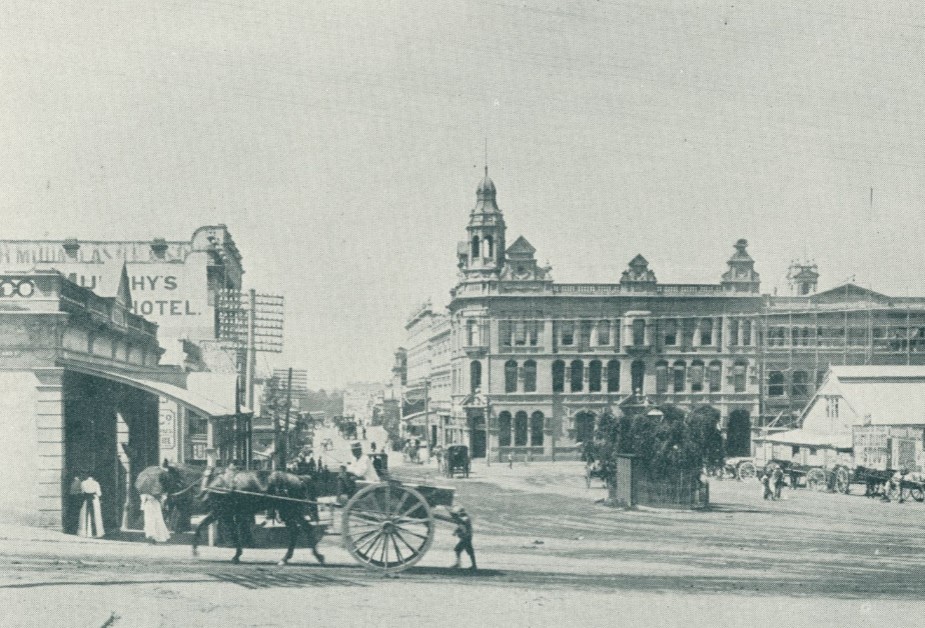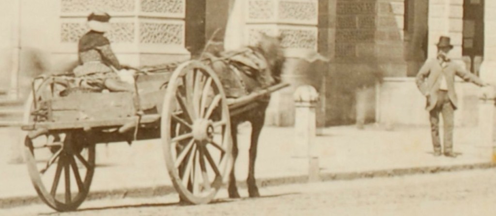A woman sits in a dilapidated looking cart – perhaps she is waiting for her respectable friend at the post office window. Or she is waiting for one of the menfolk to get his lazy rear end off the post office steps. Parking outside the GPO has not been this easy since the invention of the horseless carriage. Today there’s a taxi rank that starts near where the man stands, and the sound of impatient cabbies honking their horns to get a berth there echoes around the street.