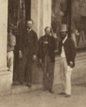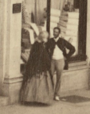 A lady confers with a man outside the drapery store. She is wearing the standard daytime clothing of a woman of the middle classes – a bonnet, shawl and full skirt. A lady of leisure (someone with servants to look after the household and buy groceries) would be wearing something less practical and more elaborate. It would not have occurred to this woman to dress to the climate, or even to a whim. The posture of the man seems a little too relaxed and familiar, and she seems to be angling slightly away from him, as politely as she can.