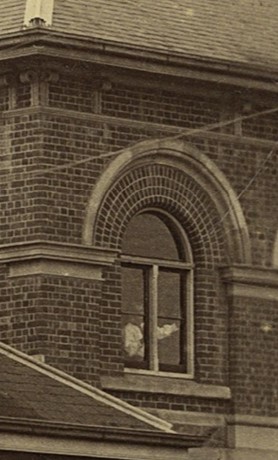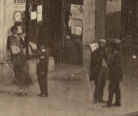 A lady in the full regalia of respectability is seen doing business at a window, while various men loaf around, leaning on everything that can possibly be leaned on. That section of the building is now a coffee shop, and today, the lady would be ordering her to-go, while the men would be at little tables, checking their devices. Nobody would be looking up or around.