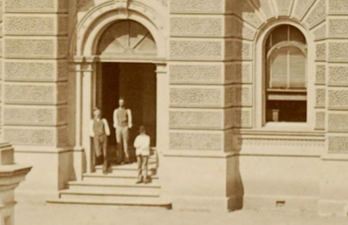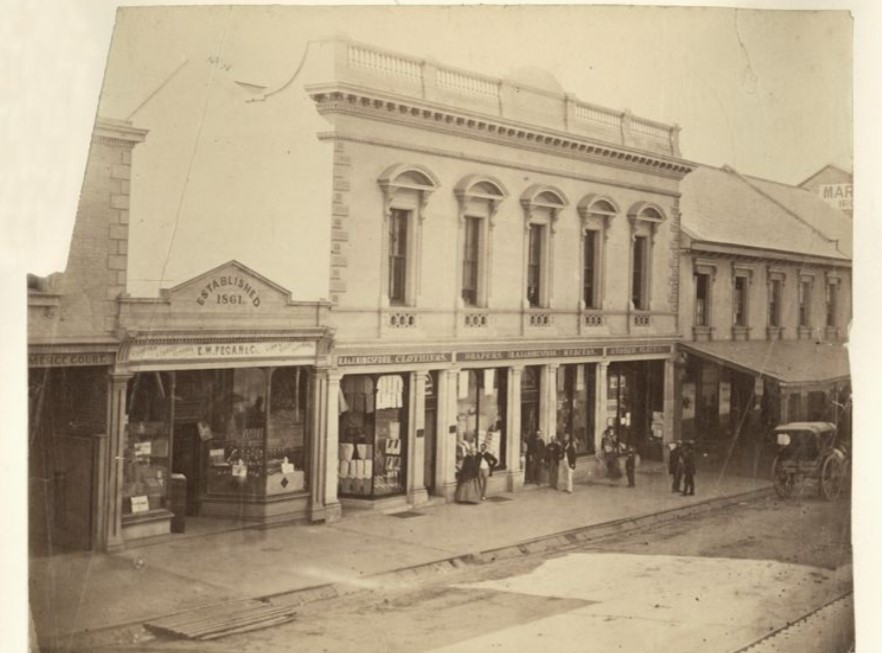 The building at the far left is a “commerce court”, and C W Fegan & Co are open for business in a building proudly established in 1861. The drapery’s building is more impressive, with large windows on the second floor, and a rooftop balcony. In the third window, barely discernable, a man looks out to observe Daintree and his apparatus.