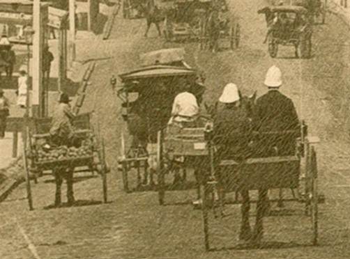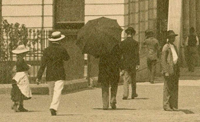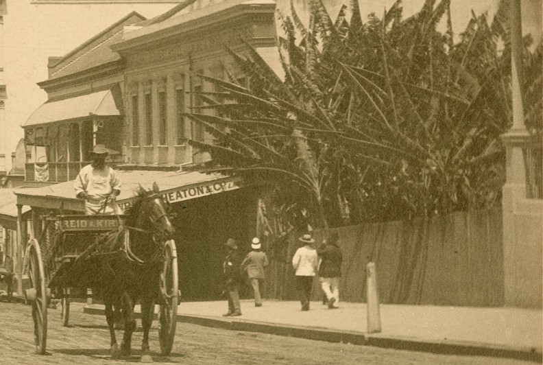 A young girl in a leghorn hat and apron is walking near or with a chap in a straw boater and white trousers. A less prosperous-looking man slouches by the side of the road. On the street, carters compete with pith-helmeted grandees for space. On the opposite side of the street, another chap in a pith helmet strides purposefully towards a store awning, and the banana trees (yes!) outside the Bank of New South Wales are in evidence.
