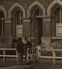 Details from the photograph show a man in his shirtsleeves looking out of an upstairs window, a gentleman waiting to pick someone up, and a couple of men conferring by the gates.