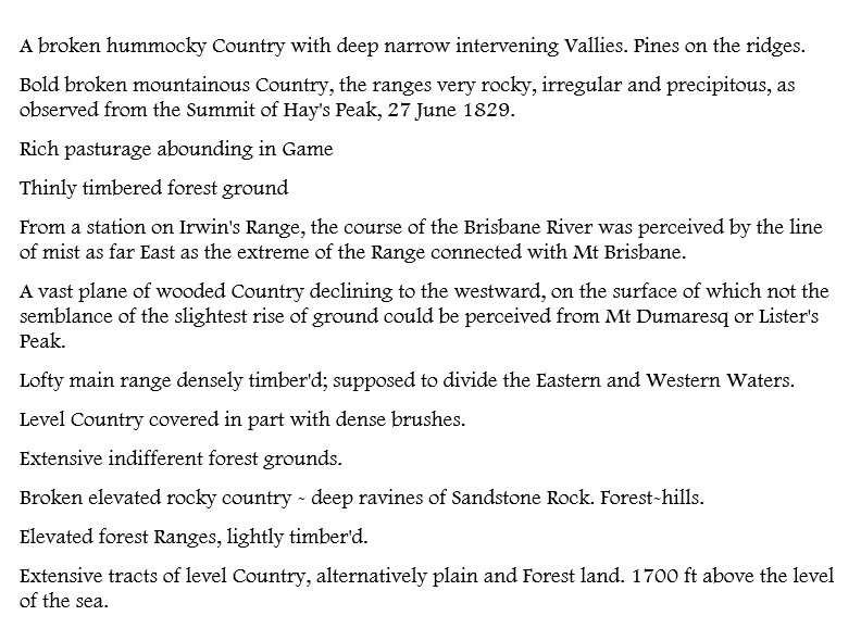 Notes from Oxley’s survey at Moreton Bay. “Fine open Country rising into Gentle Hills and Vallies. Rich Flats of Land. FINE Open Grazing COUNTRY. Rich Land and Fine Timber.”