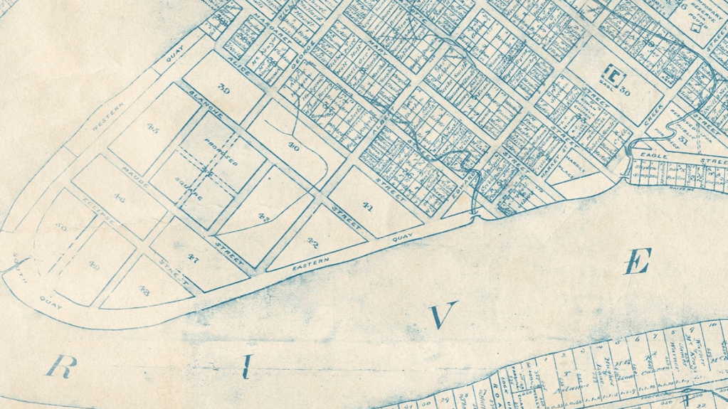 The 1855 plan of Brisbane features streets that never came into existence, thankfully. They were Blanche Street, Maude Street and Eclipse Street, bounded by Western, Eastern and South Quay. The proposed streets were occupied by the remains of the Government Gardens, now the Botanical Gardens.