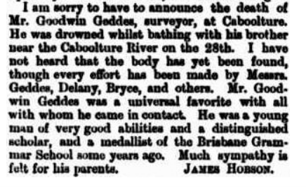 Young Goodwin Geddes’ career as a surveyor took him to distant parts of Queensland, and prior to his disappearance on 29 October 1877, he had a serious accident at Pikedale in the Southern Darling Downs. It seems to have been a fall from a horse, in which Goodwin sustained a bad head injury. He was recuperating at a beach house his father had bought near Caboolture, having been quite ill for some time. Goodwin and his brother Henry went for a swim in King John’s Creek, a tributary of the Caboolture River, when Goodwin disappeared and Henry could not find him. The family, locals and the police made a lengthy search, to no avail.