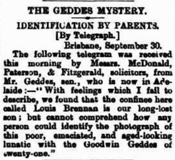 As the Brisbane and Adelaide newspapers became obsessed with the Geddes Mystery, Sergeant Atkinson – who had led the Geddes search – was sent to Adelaide to meet Mr Brennan. The policeman recognised Mr Brennan as Mr Geddes, and the inmate recognised Sergeant Atkinson.