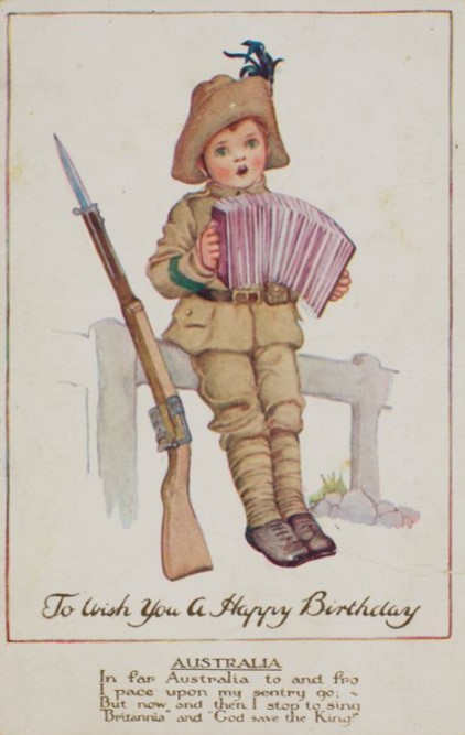 Imagine how thrilled you would be to receive this. A child with an adult-sized bayonet and an accordion, singing about how willing he was to rush off and fight for England. (From the collection of Frederick James Bassett, at the State Library of Queensland.)