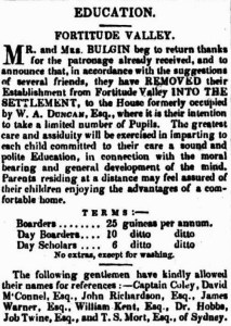 Mrs Bulgin’s school grew and prospered through to the mid-1850s, and was probably one of the better schools in Brisbane Town. Any number of respectable and pseudo-respectable ladies and gentlemen advertised their willingness to take pupils over the years, but most left town in haste and with unpaid fees and rents. (The earliest school in Brisbane had operated for the children of soldiers, convict children and servants’ children, and closed with the penal colony in 1842. A Catholic school was set up in 1845, and other denominations followed; all were fee-paying, and many children simply went without any schooling at all until the National School system was implemented after Separation in 1859.)