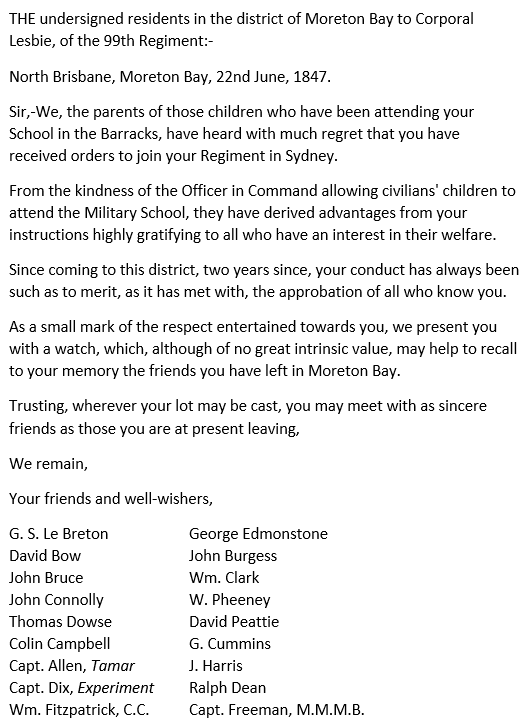 Corporal Lesbie of the 99th Regiment arrived in 1845, and was permitted to include civilian children in his classes. His reassignment in 1847 left a small community bereft, and a public testimonial was printed in the Moreton Bay Courier: