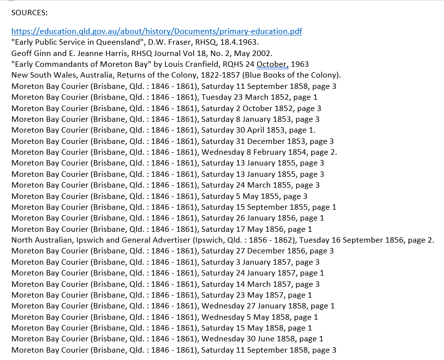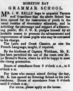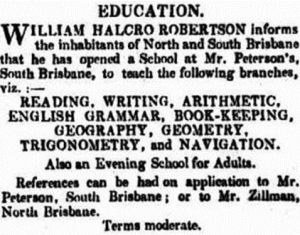 Quite a few private schools still tried to attract the public and failed quickly. The Rev. James Carter (late Curate of St. James, Sydney, mind) suggested that he could cure Brisbane Town of all its heathen propensities, starting with the children. “The leading object of the undertaking is to promote sound and enlightened education upon Christian principles, in Brisbane and the surrounding country, where, at present, a want is felt of the higher branches of instruction.” Didn’t work.