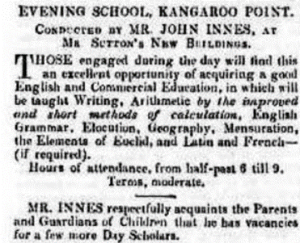 Mr John Innes decided to fill the void at Kangaroo Point with mensuration, Euclid and French (if required). Unlike Mr Welsby, he did not advertise instruction in “use of the globes.”