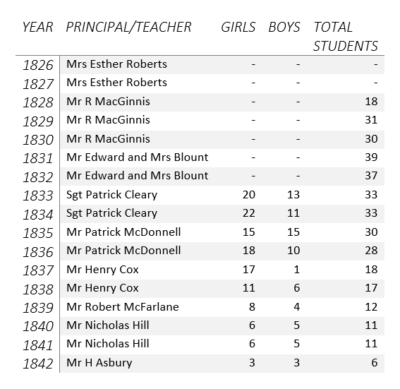 The Blue Book of the Colony for 1846 showed that there was a Catholic School under the tuition of Mary Bourke (22 boys, 13 girls), and four private schools with 22 boys and 14 girls.